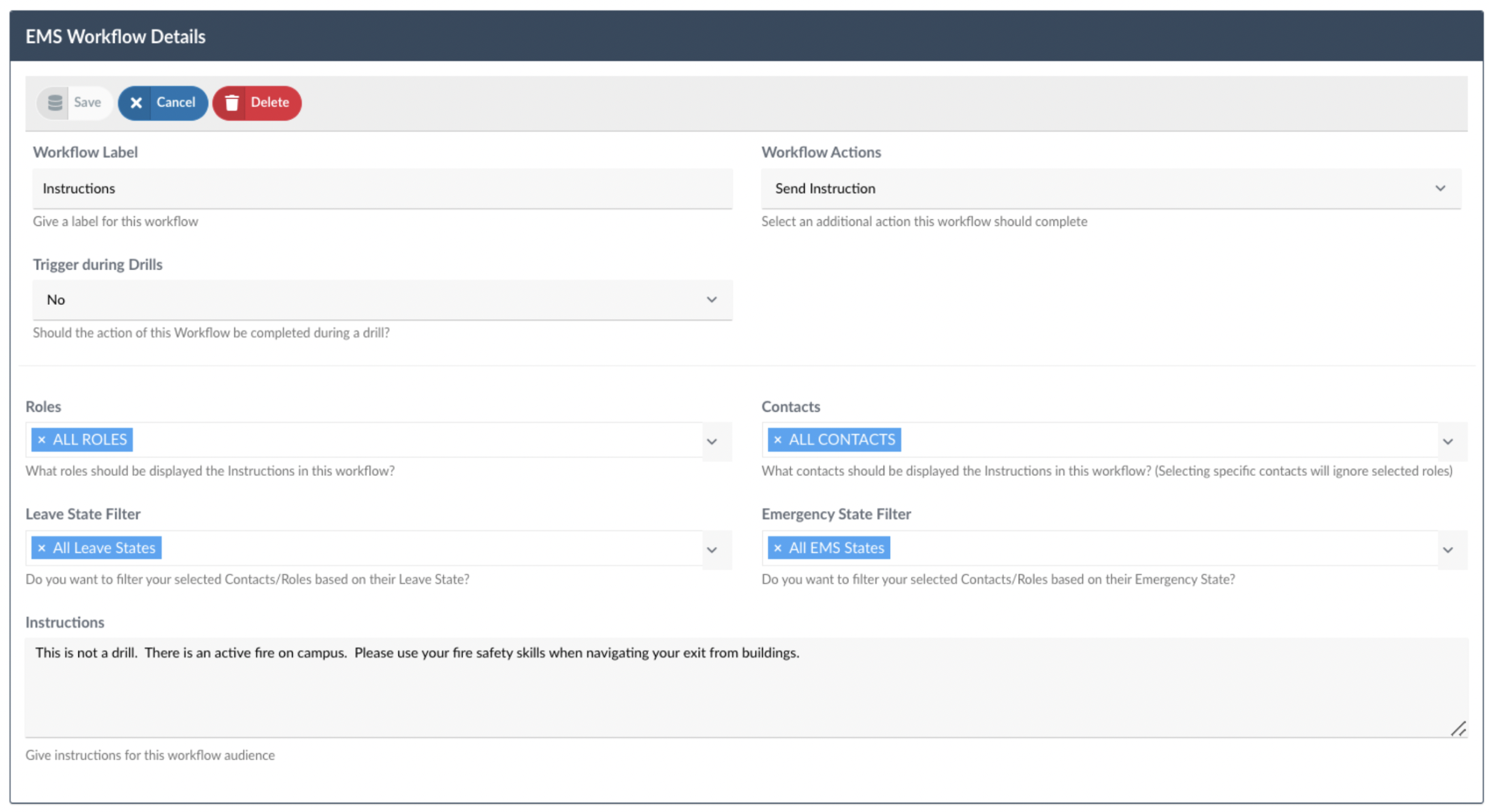 Workflow Label - Give a label for this workflowTrigger During Drills - Indicate if this workflow is to be triggered during a Drill for Emergency ProfileRoles/Contacts - Define which Roles or Contacts should be sent the instructions (Selecting specific contacts will ignore selected roles)Leave State Filter - Filter your selected Contacts/Roles based on their Leave StateEmergency State Filter - Filter your selected Contacts/Roles based on their Emergency StateInstructions - Define instructions for this workflow audience